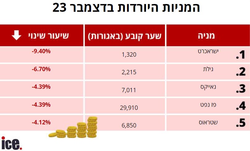 במקום הרביעי ברשימת היורדות נמצאת מניית פז נפט שירדה ב-4.39% לרמה של 29,910 נקודות והחמישית ברשימת היורדות היא שטראוס שירדה ב-4.12% לרמה של 6,850 נקודות.