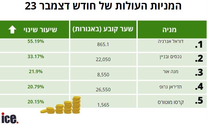 מניית דוראל אנרגיה היא המניה שעלתה באחוזים הגבוהים ביותר בבורסה בחודש דצמבר, עם עלייה של לא פחות מ-55.59% ונסחרת בשער של 865.1 נקודות, ואחריה נמצאת מניית נכסים ובנין, שעלתה ב-33.17% לרמה של 22,050 נקודות. שלישית ברשימת העולות היא מניית מגה אור שעלתה ב-21.90% ונסחרת ברמה של 8,550 נקודות.