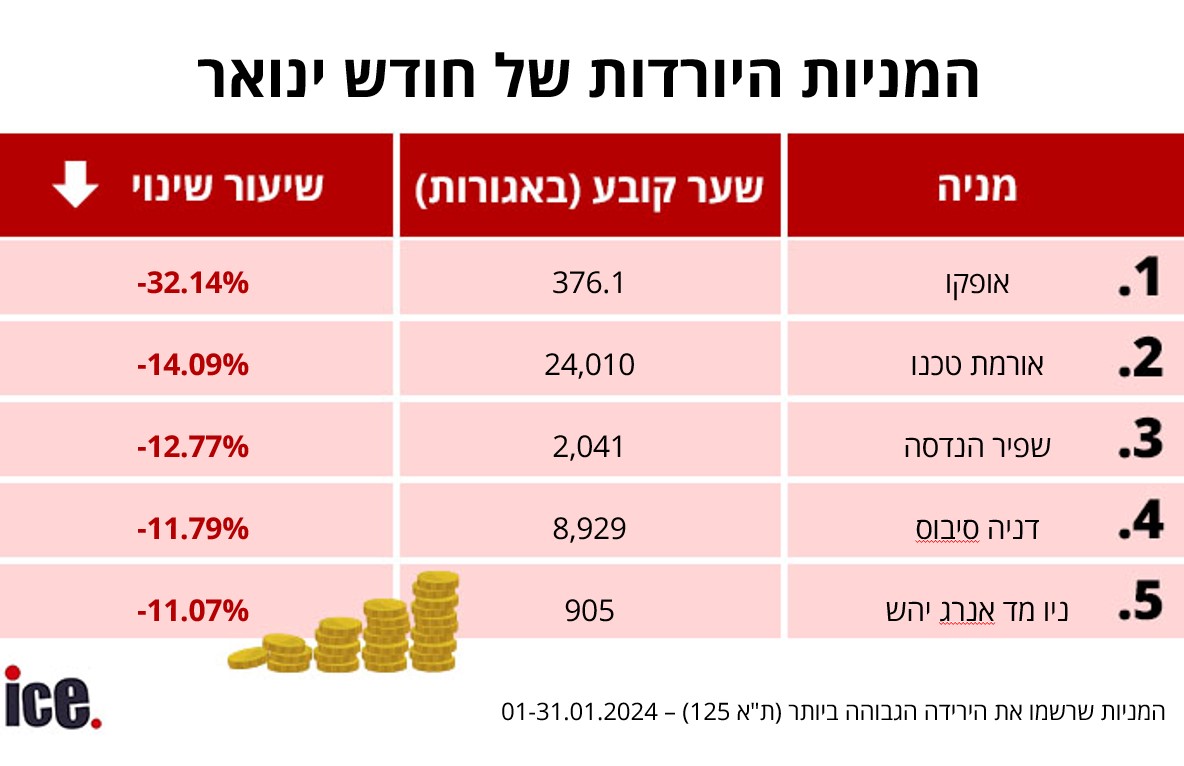 על פי חמש המניות היורדות של חודש ינואר במדד ת"א 125, המפסידה הגדולה היא חברת "אופקו". על פי הנתונים, מנייתה צנחה ב-32.14% לרמה של 376.1 אגורות. במקום השני, חברת "אורמת טכנו" ירדה ב-14.09% לרמה של 24,010 אגורות.