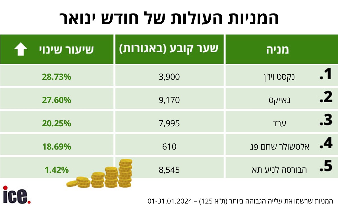 לאחר ארבעה חודשים מתחילת המלחמה, מדד ת"א 35 ירד ב-3.39% לרמה של 1,830.82 נקודות ומדד ת"א 125 ירד ב-3.19% לרמה של ב1,861.92 נקודות. בקרב חמש המניות העולות של חודש ינואר במדד ת"א 125, המנצחת הגדולה היא חברת "נקסט ויז'ן", אשר מנייתה גדלה ב-28.73% לרמה של 3,900 אגורות.