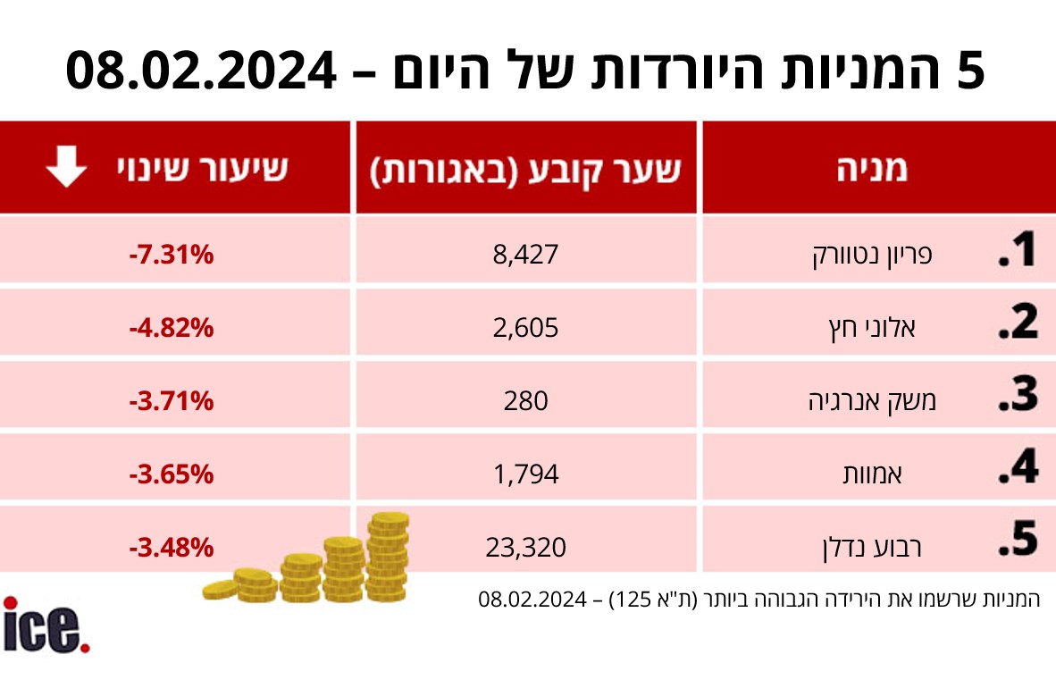 ובמעבר לרשימת המניות היורדות של היום, פריון נטוורק ירדה בשיעור של7.31% לרמה של 8,427 אגורות. מניית אלוני חץ ירדה ב-4.82% לרמה של 2,605 אגורות. משק אנרגיה ירדה בשיעור של 3.71% לרמה של אגורות 280. אחר כך התמקמה מניית אמות ירדה ב-3.65% לרמה של 1,794 אגורות. את הרשימה סוגרת רבוע נדלן אשר ירדה ב-3.48% לרמה של 23,320 אגורות.