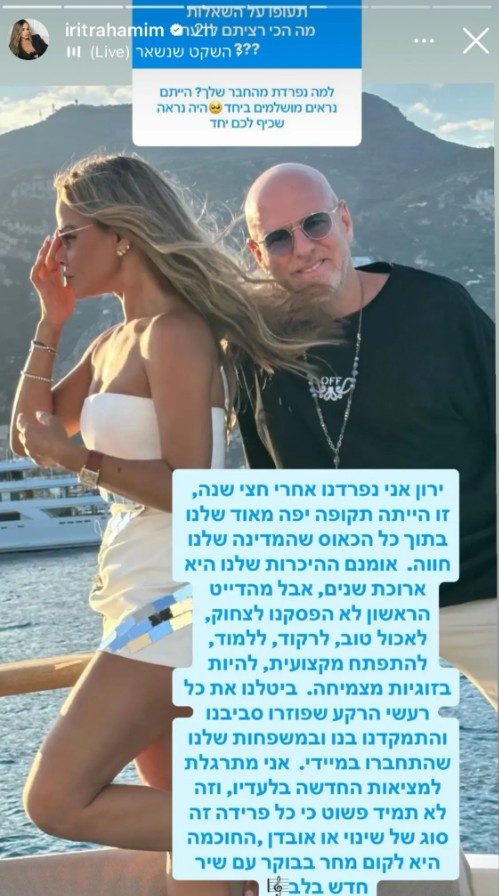 אירית רחמים מגיבה לראשונה לפרידה מאיש העסקים ירון תשבי, אחרי כחצי שנה בלבד של זוגיות: "הייתה תקופה יפה מאוד שלנו בתוך כל הכאוס שהמדינה שלנו חווה"