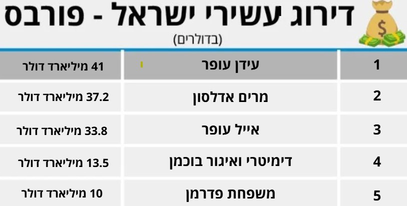 עידן עופר כאמור, הוא האיש העשיר ביותר בישראל עם הון שמוערך בכ-41 מיליארד דולר. שנייה לו אדלסון, שמוערכת בכ-37.2 מיליארד דולר. אייל עופר סוגר את השלישייה הראשונה ונותר יציב עם הון המוערך בכ-33.8 מיליארד דולר.