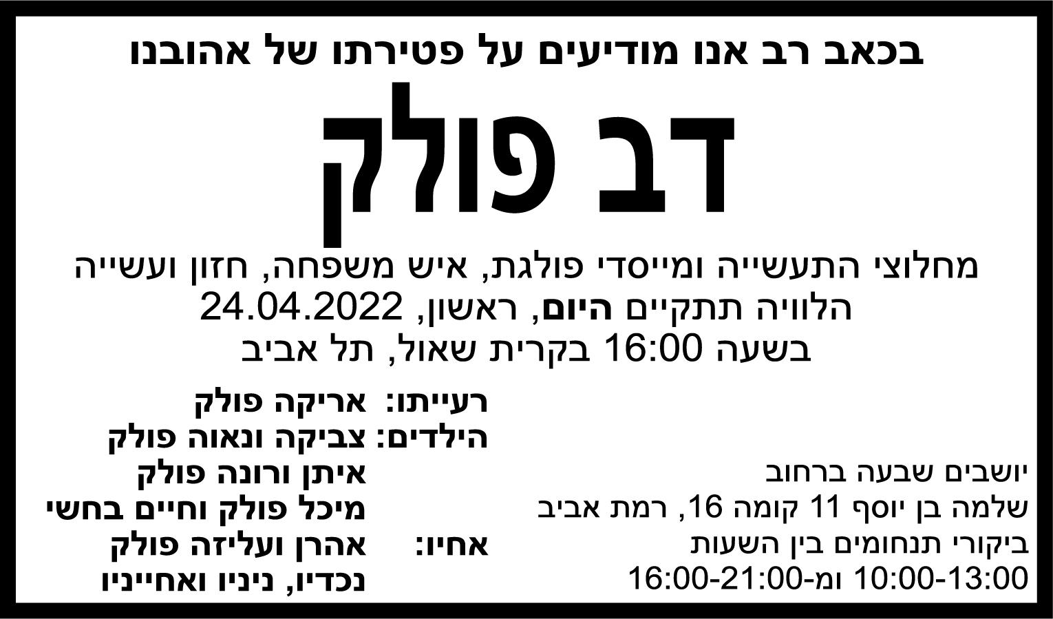 התעשיין ואיש העסקים דב פולק, ממקימי מה שנחשבה לסמלים הבולטים בתעשיית הטקסטיל בישראל פולגת, הלך לעולמו. זכה בפרס קפלן לתעשייה ובפרס התעשייה ונחשב לאחד מאנשי העסקים הבולטים במשך שנים רבות