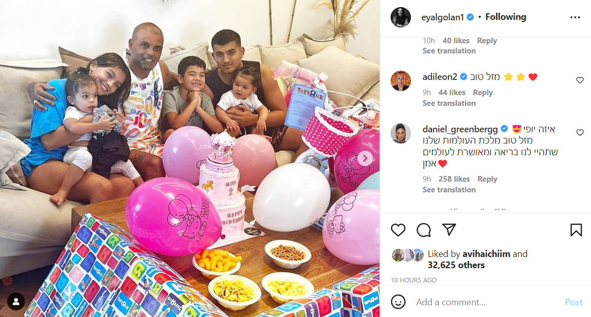 גולן כתב: "התחלנו בחגיגות יום ההולדת לנסיכה הקטנה שלי, חגיגות באופן הכי מושלם שיש כמו שתמיד חלמתי.. כל המלאכים שלי ביחד אצלי, כל אח הביא לה מתנה, שרים, רוקדים, חוגגים ובעיקר אוהבים".