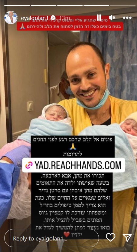 עוד מסופר: "מיד לאחר שהתאוששתי מהניתוח אזרתי כוחות ועליתי למחלקת יולדות, למרות הכאבים הייתי חייב לראות את אשתי ואת התאומים שנולדו לנו. תאומים קטנים ותמימים שמביטים בי במבט שכבש אותי, התמלאתי באושר וגם בתקווה. חשבתי שהכל מאחוריי ונהנתי מכל שניה עם אשתי וילדיי שהביאו אור לחיי. לא חשבתי לרגע שבתוך כל האושר הזה אתמודד עם בשורה קשה".