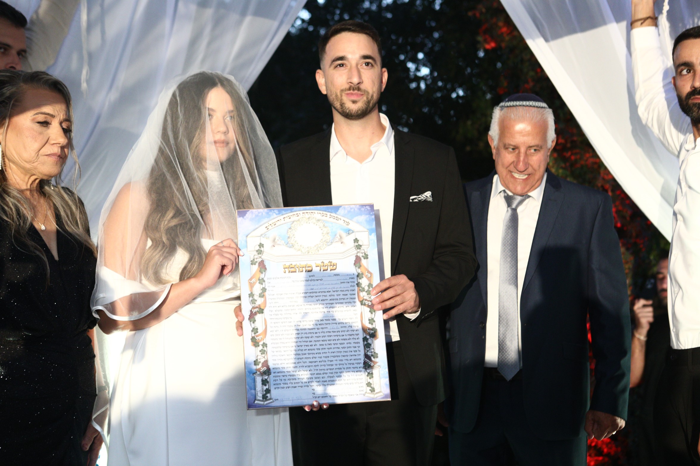 בכניסה לחצר הבית שהפך בין לילה לגן אירועים, נערכה קבלת פנים למוזמנים, שכללה ארוחת שף, בר משקאות עשיר ולהקת מוזיקה שקיבלה את האורחים. לאחר הקוקטייל החל טקס חופה כהלכתו שנערך ע"י רב המועצה הדתית של סביון, שמואל ביסטריצקי יחד עם הרב של העיר אופקים הרב אסף וקנין.