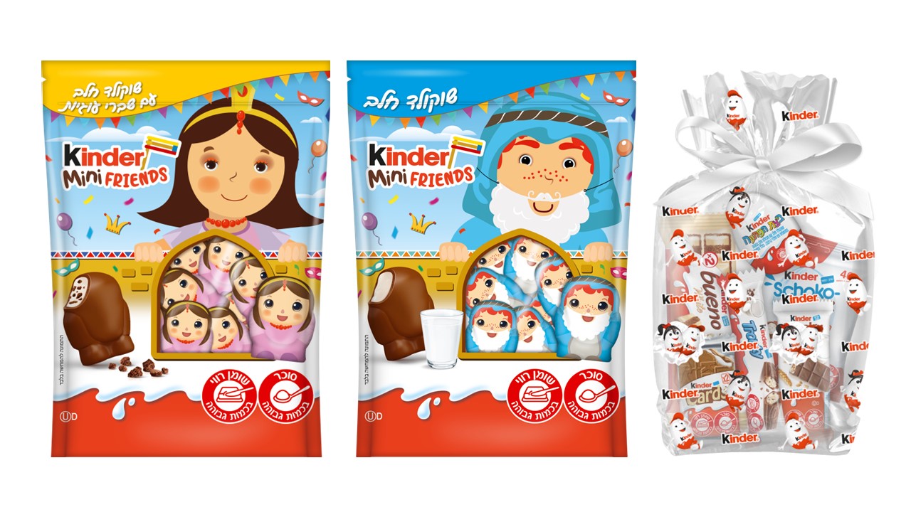 קינדר מיני פרנדס יוצאת במהדורה מיוחדת לפורים,משלוח מנות שוקולדי. המארז כולל שני טעמים :קינדר מיני פרינדס חלב וקינדר מיני פרינדס עם שברי עוגיות, בעיצוב פורימי של אסתר המלכה ומרדכי היהודי. השוקולדים מגיעים באריזה חגיגית מעוטרת בסמלי פורים עם מדבקות שעשויע לילדים באווירה פורימית.