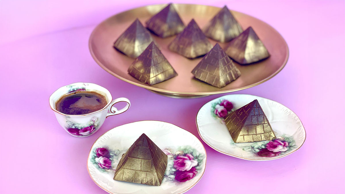 כשהשוקולד מוכן והפרלין יציב, קלפו את השקף בזהירות. מתקדמים יכולים לצייר עם כלי חד את לבני הפירמידה ולעטר באבקת זהב מנצנצת להשלמת האפקט. שמרו את הפירמידות במקרר או במקפיא.
