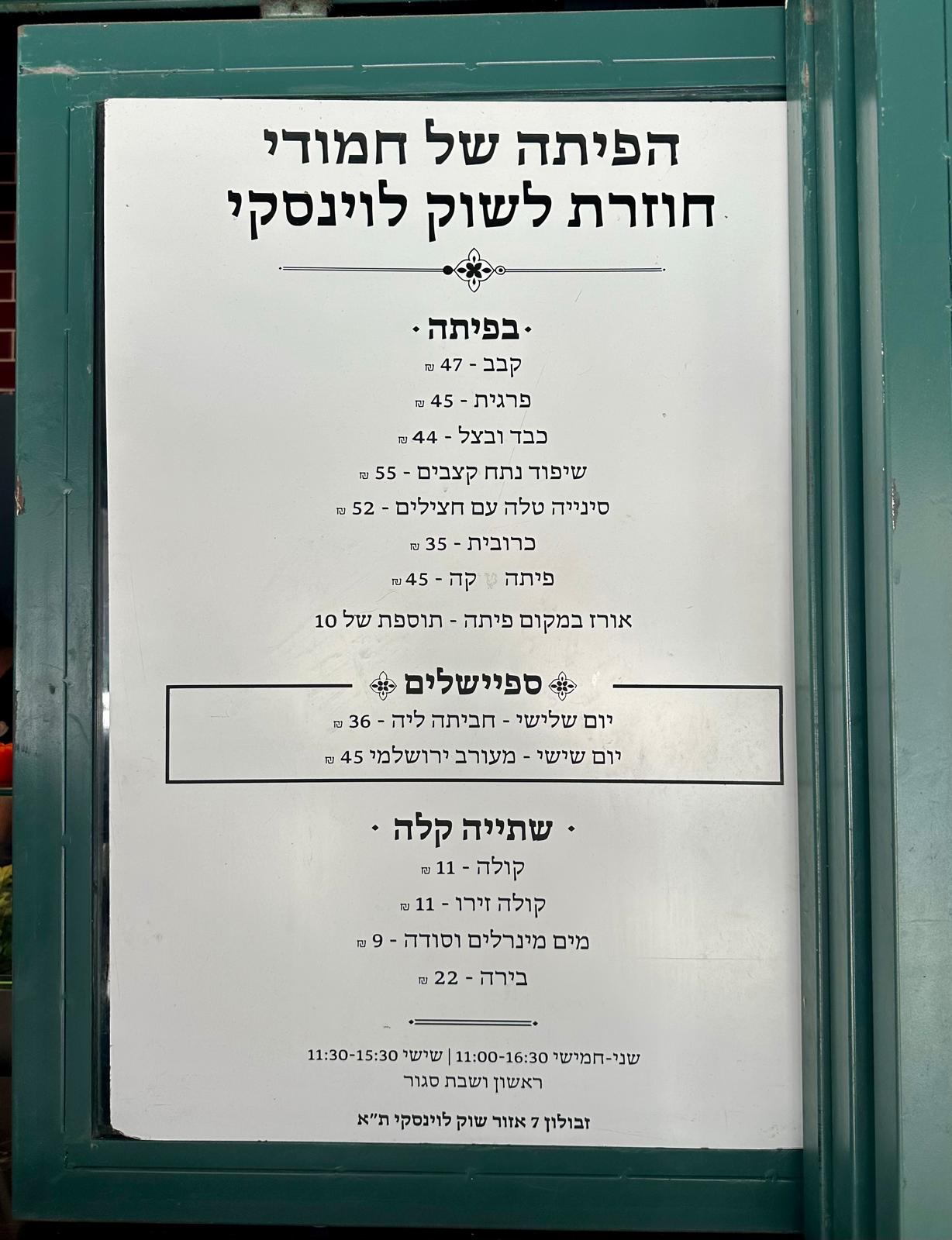 בנוסף לכך, במקום תוכלו להזמין גם פיתה עם פרגיות (45 שקלים), שיפוד נתח קצבים (55 שקלים), סינייה טלה עם חצילים (52 שקלים), כרובית לטבעונים (35 שקלים) ועוד. במקום גם ספיישלים משתנים, ואם יתמזל מזלכם בשלישי תוכלו לטעום מהחביתה עם ליה (שומן טלה) המפורסמת (36 שקלים) של חמודי ובשישי מהמעורב ירושלמי (45 שקלים).