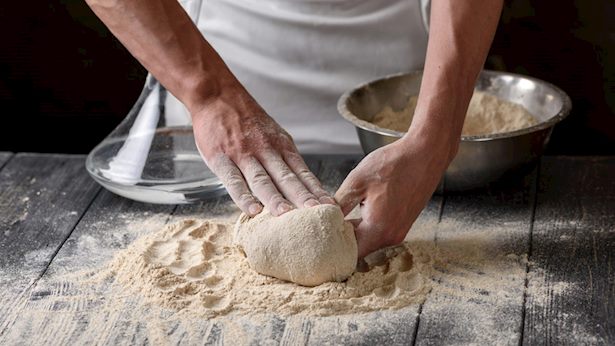שמים את כל מרכיבי הבצק מלבד מלח בקערת מיקסר ולשים (אפשר גם ביד). אחרי שהבצק מתגבש מוסיפים את המלח ולשים עוד כחמש דקות. כסו את הקערה ותנו לבצק לנוח כ-10 דקות לפני שתתחילו לעצב אותו למאפים.