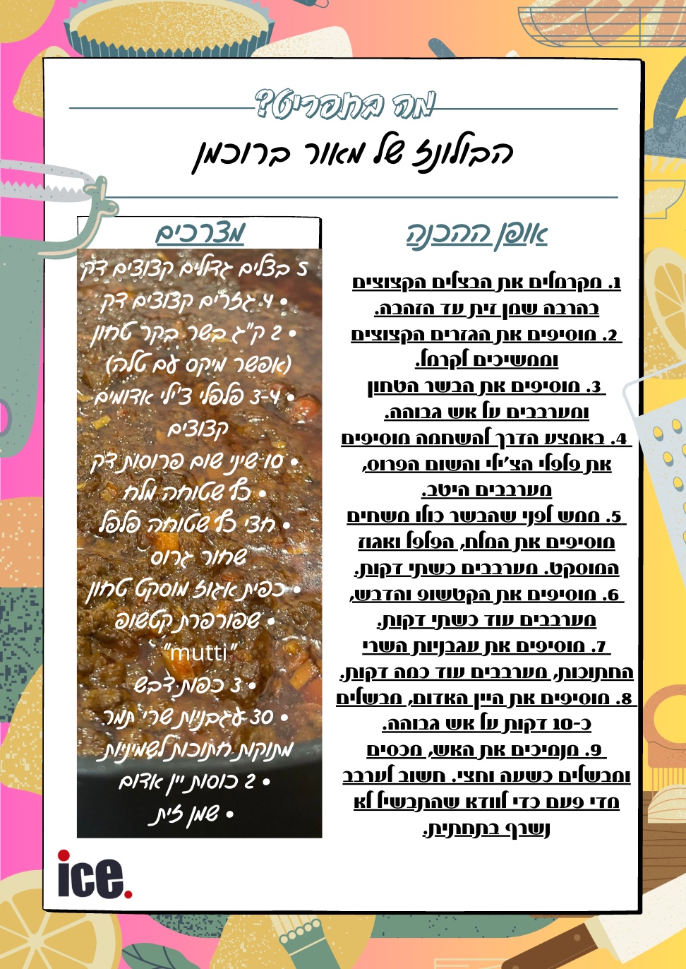 מצרכים: 5 בצלים גדולים קצוצים דק, 4 גזרים קצוצים דק, 2 ק”ג בשר בקר טחון (אפשר מיקס עם טלה), 3-4 פלפלי צ׳ילי אדומים קצוצים, 10 שיני שום פרוסות דק, כף שטוחה מלחחצי כף שטוחה פלפל שחור גרוס, כפית אגוז מוסקט טחון, שפורפרת קטשופ ״מוטי״, 3 כפות דבש, 30 עגבניות שרי תמר מתוקות חתוכות לשמיניות, 2 כוסות יין אדום, שמן זית.