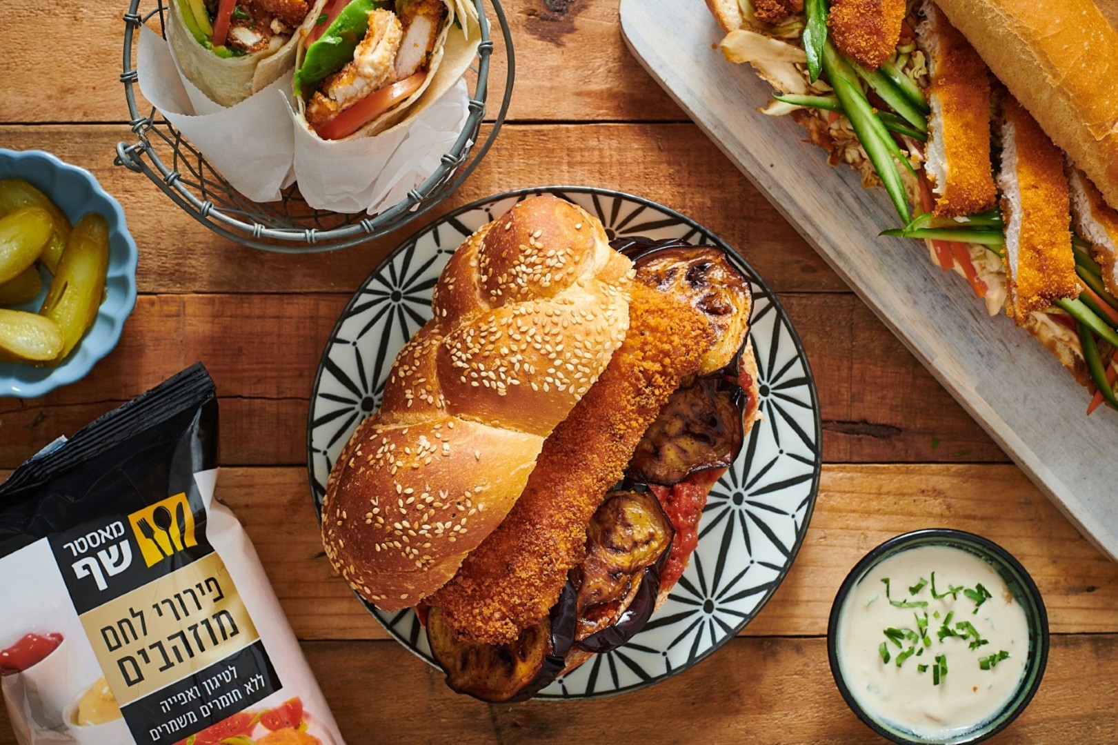 שניצל בבגט - בסגנון מוקפץ תאילנדי (עם רטבים אסייתים) – מערבבים בקערה רצועות של כרוב, גזר ופלפל עם טריאקי, מורחים את הבגט במיונז לחיץ ספייסי מאסטר שף וממלאים בירקות וברצועות שניצל + סריראצ'ה בסיום