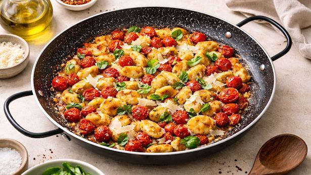 במתכון הזה הניוקי נצרבים במחבת פאייה רחבה, המאפשרת פיזור אחיד והשחמה יפה של הכיסונים (אך אל דאגה, ניתן להכין את המנה באותה קלות גם במחבת רגילה ורחבה). בתוך זמן קצר מתקבלת מנה חמה, זהובה ומלאת טעם: הניוקי פריכים מבחוץ ורכים מבפנים, עגבניות השרי מתרככות, מתפוצצות קלות ויוצרות רוטב טבעי ומהיר, והכול מתחבר יחד עם חמאה, שום ושבבי פרמזן שמעניקים עומק טעמים עשיר.