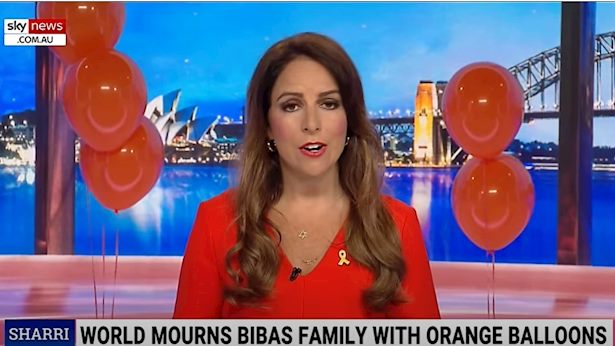 כשמאחוריה בלונים כתומים, מגישת רשת סקיי ניוז האוסטרלית, שרי מרקסון, הביעה זעזוע עמוק מרצח הילדים אריאל וכפיר ביבס, יחד עם אמם שירי ביבס.