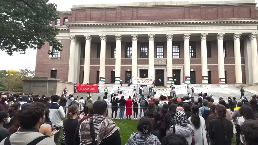 הפגנה פרו פלסטינית באוניברסיטת הרווארד (צילום יוטיוב/ WCVB Channel 5 Boston)