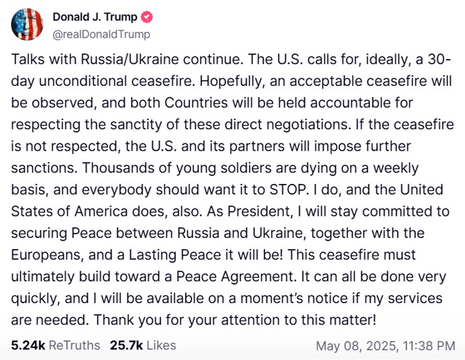 בפוסט כתב טראמפ: "הפסקת האש הזו חייבת בסופו של דבר להתפתח לקראת הסכם שלום. הכל יכול להיעשות במהירות רבה, ואהיה זמין בהתראה של רגע אם שירותיי יידרשו" וציין כי רואה בשתי המדינות כאחראיות לקיום הפסקת האש, על אף כי היה מצופה שיטיל את האחריות על רוסיה.