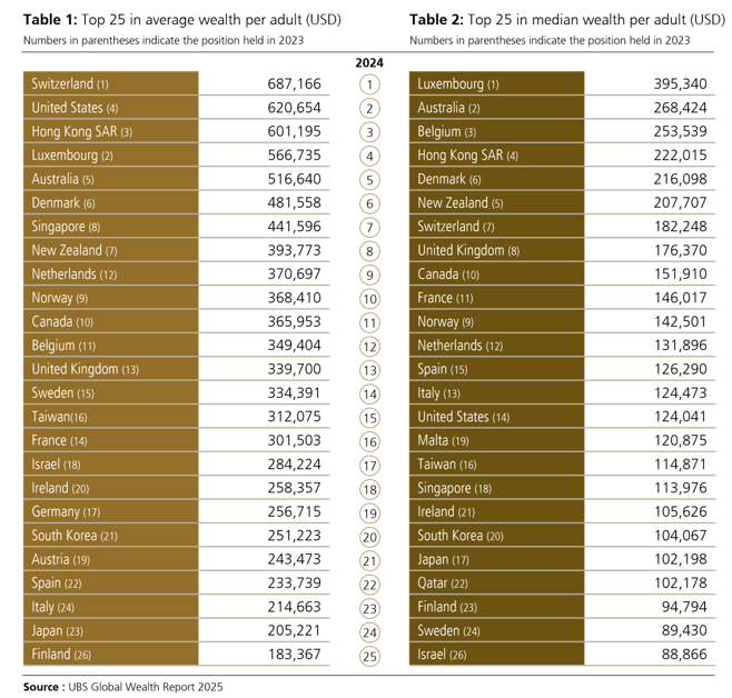 דו"ח העושר העולמי של UBS, מהדורת 2025: בשנת 2024, העושר העולמי צמח ב-4.6% לאחר עלייה של 4.2% ב-2023. שוויץ המשיכה לעמוד בראש הרשימה של העושר הממוצע למבוגר ברמת השוק הפרטי