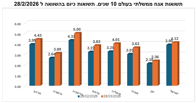 בעוד שדווקא בישראל עליית התשואות באג"ח לעשר שנים היא קטנה יחסית (0.2%), הרי שבארה"ב הן עלו בכחצי אחוז ובבריטניה התשואה האמירה ל 5%, עלייה של כ 0.7%. זאת אומרת שהמחזיקים באגרת הבריטית לעשר שנים ספגו הפסד של כ 7% מתחילת החודש.