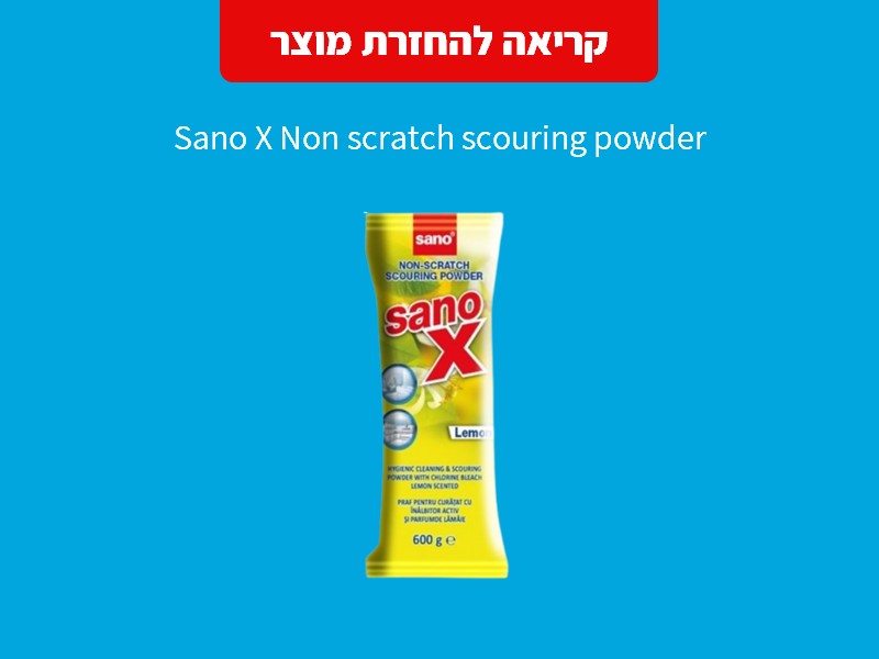 קריאה להחזרת מוצר (ריקול) הוכרזה על המוצר Sano X Non scratch scouring powder של חברת סנו. כך על פי הפורטל הישראלי לבטיחות מוצרי צריכה במשרד הכלכלה והרווחה.