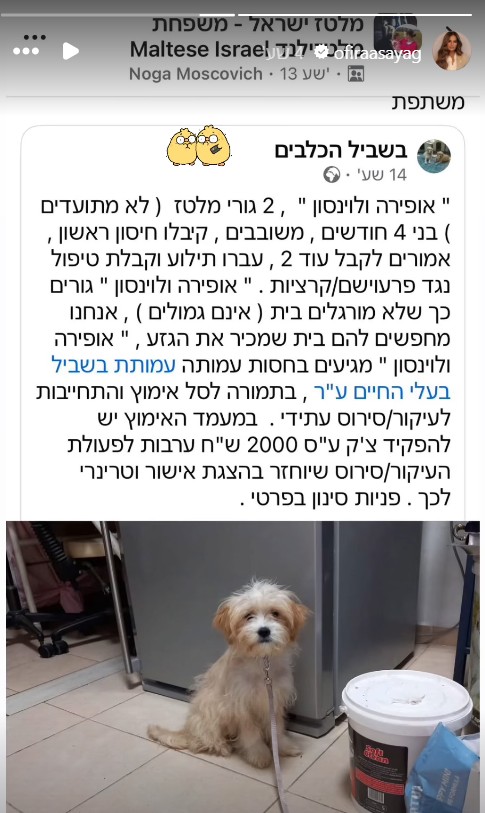 מגישת ערוץ 12, אופירה אסייג, שיתפה אמש את תמונתה של גורת המלטז שנושאת את שמה הפרטי - כמובן, לצד הכלבלב השובב לוינסון שמועמד יחד איתה לאימוץ מהיר.