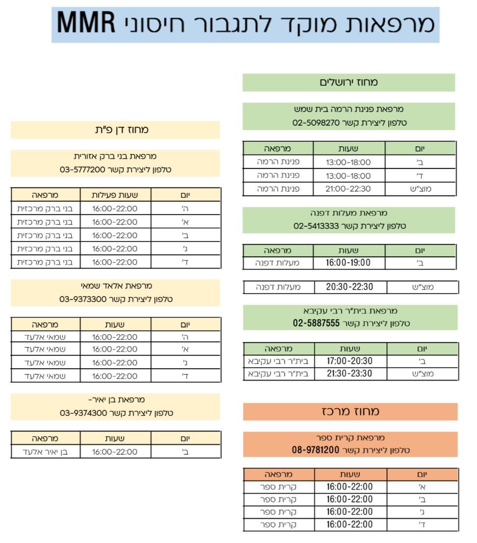 רשימת המתחמים ומרפאות כללית שבהם ניתן לקבל את החיסון מצורפת (ועשויה להתעדכן). המתחם בבני ברק ייפתח כבר הערב, ובירושלים-ממוצאי שבת. ניתן לפנות גם למרפאות המטיילים. למידע נוסף ניתן לפנות למרפאת האם, למוקד כללית בטלפון 2700 או למרפאות המטיילים. לפרטים נוספים ניתן לפנות למרפאת האם, למוקד כללית 2700* או למרפאות מטיילים.