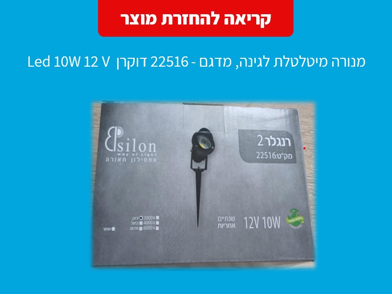 מנורה מיטלטלת לגינה, מדגם - 22516 דוקרן Led 10W 12 V, מק"ט 22516 של היצרן: ZHONG SHAN. ארץ ייצור: סין נקראת להחזרה לאחר שהתברר כי בעת השימוש הוא גורם לשיבוש פעילות של מכשירים אלקטרוניים