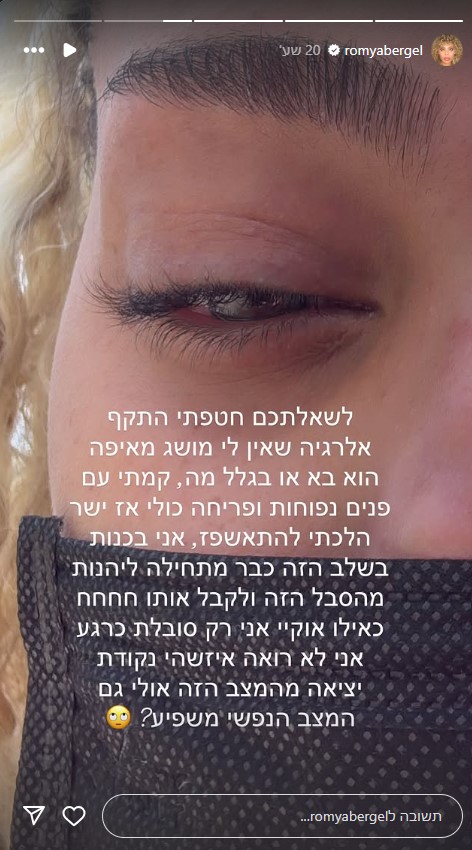 בסטורי שהעלתה לחשבון האינסטגרם שלה, היא צירפה תמונה של פניה וכתבה: "לשאלתכם חטפתי התקף אלרגיה שאין לי מושג מאיפה הוא בא או בגלל מה. קמתי עם פנים נפוחות ופריחה כולי, אז ישר הלכתי להתאשפז".