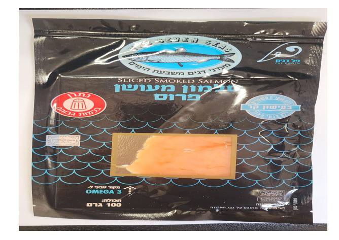 סלמון מעושן מהמותג "מעדני הדגים משבעת הימים", תכולה: 100 גרם. ברקוד: 7290014435704.