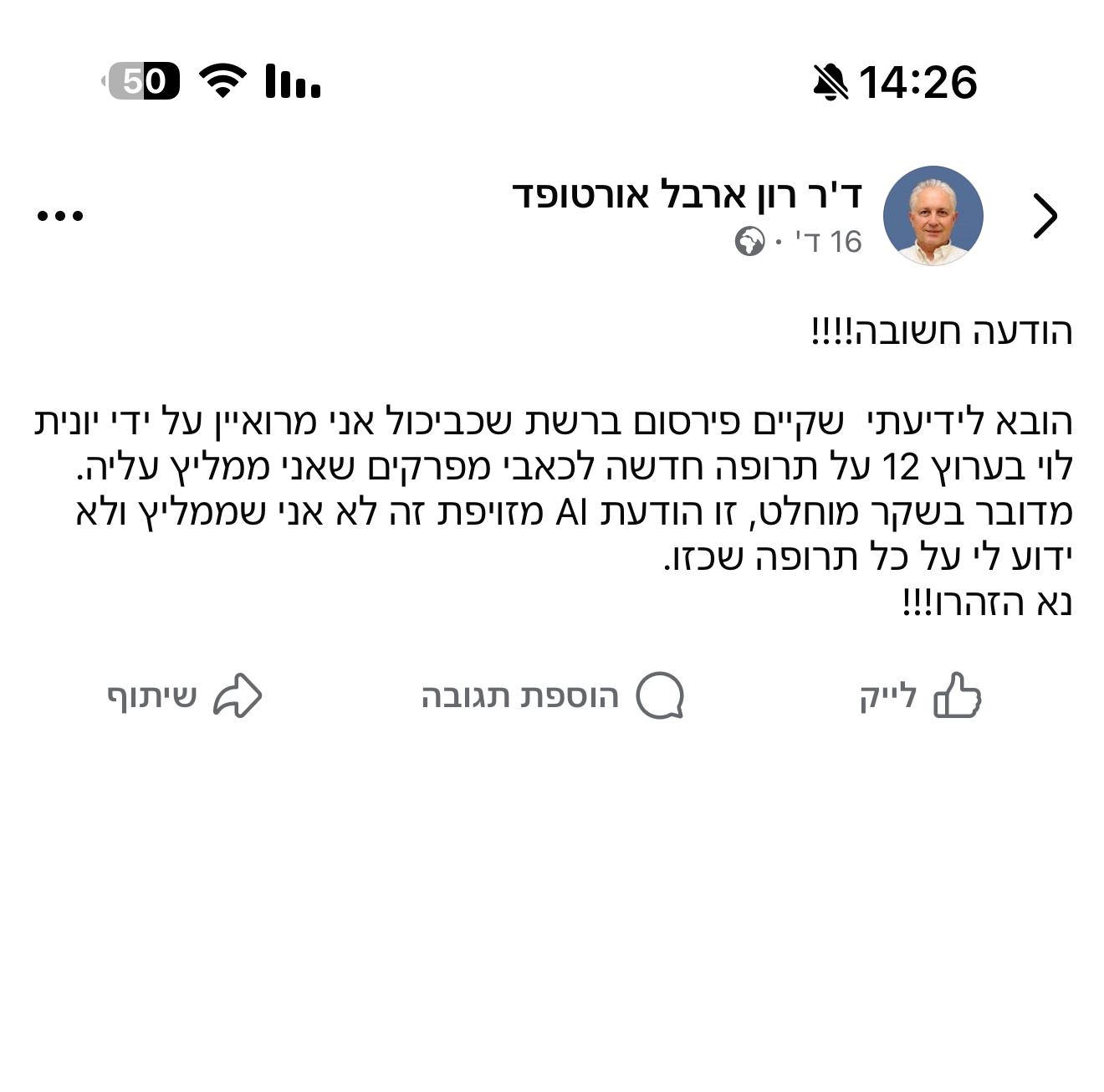 בין הרופאים ששמם נוצל ללא ידיעתם נמצא גם ד"ר רון ארבל, שהזהיר כי באמצעות AI פרסמו ברשתות החברתיות שבו כאילו הוא מתראיין וממליץ על תרופה חדשה לכאבי מפרקים. "מדובר בשקר מוחלט", הבהיר ד"ר ארבל. "זו הודעת AI מזויפת, זה לא אני שממליץ ולא ידוע לי על כל תרופה שכזו. נא היזהרו".