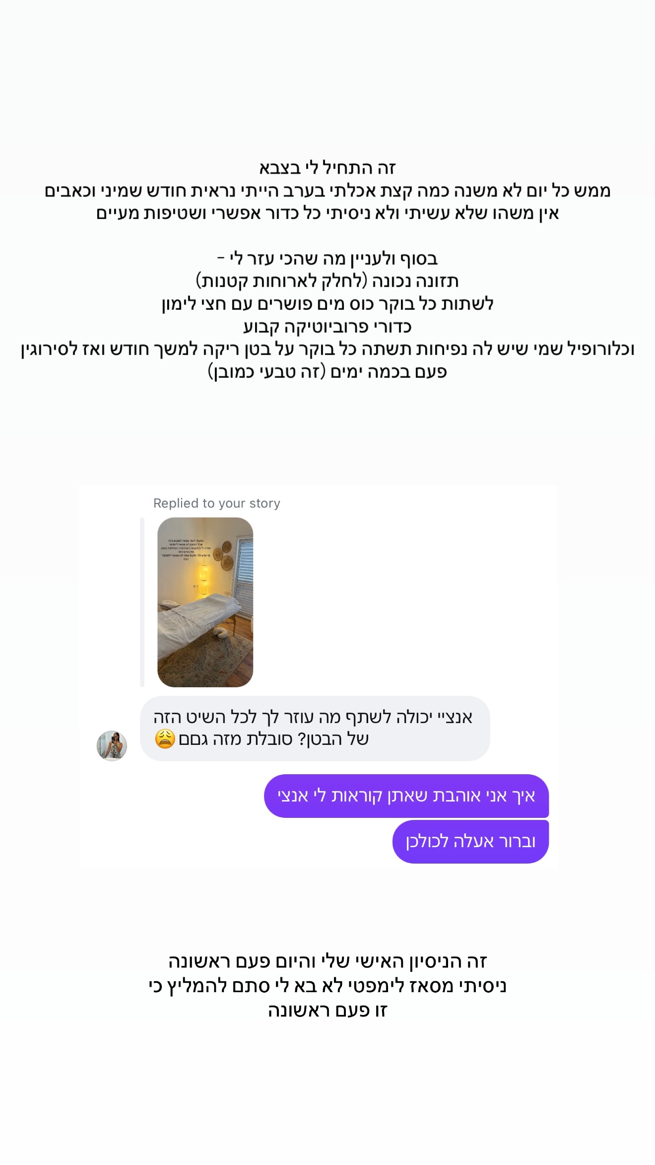 "הגעתי לעוד מסאז' לשבוע הזה אבל הפעם זה מסאז' לימפטי. חזרה לי בתקופה האחרונה הנפיחות בבטן", כתבה בסטורי והוסיפה: "אין סיוט כזה. מי שיש לה יודעת שזה לא אפשרי לתפקד ככה".