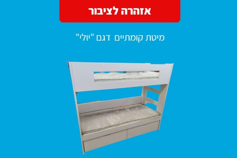 הממונה על התקינה במשרד הכלכלה והתעשייה, הודיע אמש (ראשון) לציבור הצרכנים בישראל על ליקויים שנמצאו במיטת קומתיים דגם- "יולי", העלולים לסכן את הילדים המשתמשים בה.
