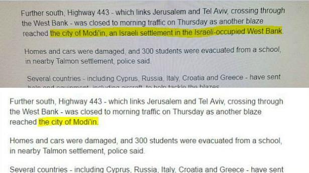 גל השריפות וההצתות ברחבי ישראל, זוכה לסיקור בינ"ל, ובאופן לא מפתיע, גם לסיקור מוטה. אתר רשת BBC הבריטית ציין כי אחת השריפות התרחשה בעיר מודיעין - "התנחלות ישראלית בגדה המערבית". ברשת החברתית החלו לציין זאת, ובהמשך אם או בלי קשר, הניסוח שונה. להלן 2 הגרסאות - הישנה למעלה, והחדשה -למטה.