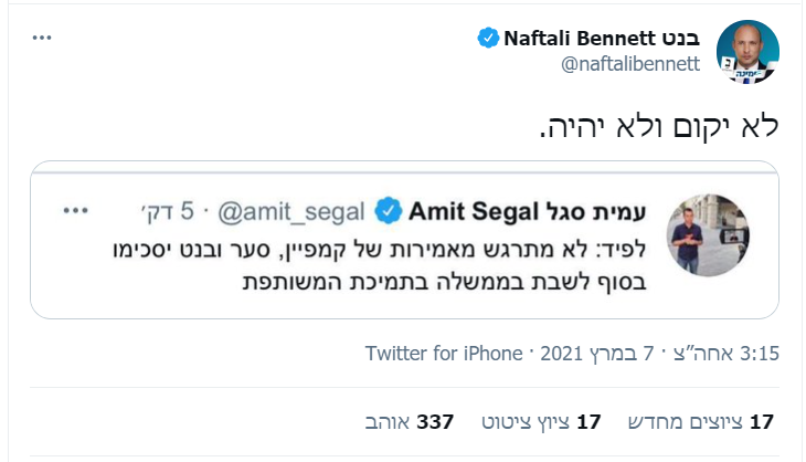 יושב ראש מפלגת "ימינה" לא נשאר אדיש והגיב בדף הטוויטר שלו: "לא יקום ולא יהיה". בהמשך התראיין גם כן לוועדת המשפיעים והצהיר כי "ימינה" לא תשב תחת ראש ממשלה מהשמאל ושיאיר לפיד הוא שמאל.