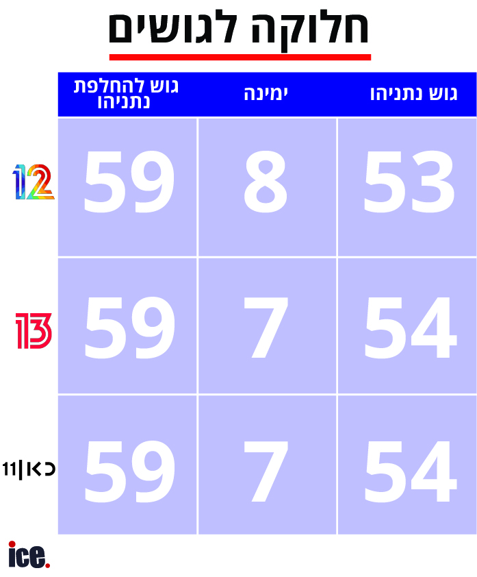 כזכור, על פי המדגם של חדשות 12 ומנו גבע, לליכוד 31 מנדטים, יש עתיד 18, ש"ס - 9, הרשימה - 9, ימינה - 8, כחול לבן - 7, העבודה - 7, הציונות הדתית - 7, ישראל ביתנו -6, יהדות התורה - 6, סער - 6, מרצ - 6, רע"ם וזליכה לא עוברים.
