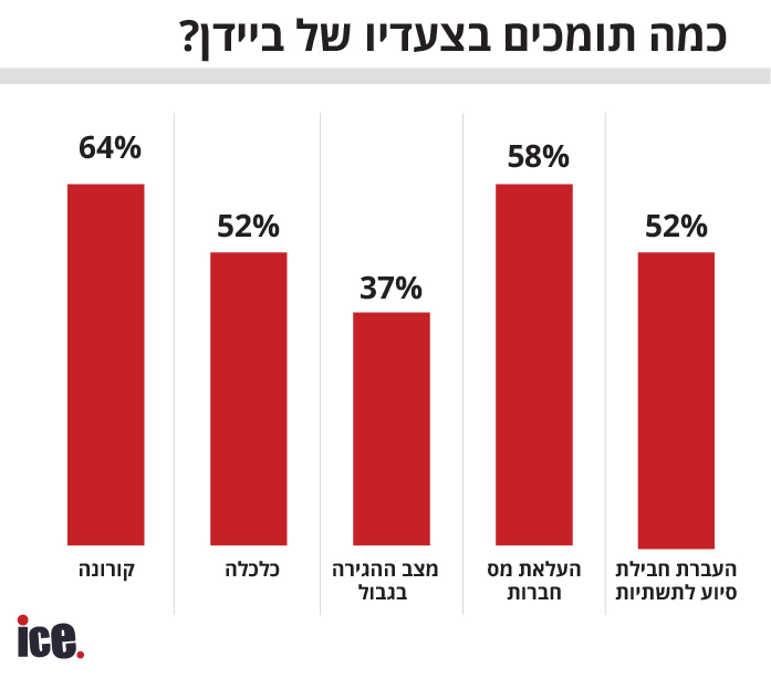 מבחינת התמיכה ביוזמות של טראמפ עד כה 58% הביעו תמיכה בהצעתו להעלות אחוזי מס חברות. אך רק 52% תמכו בהחלטתו להעביר חבילת סיוע לתשתיות בסך 2 טריליון דולר ואחוז זהה קיבל הנשיא ביידן על ניהול הכלכלה האמריקאית במאה הימים הראשונים. פחות ממחצית מהנשאלים, 52% טענו כי המדיניות הכלכלית של טראמפ טובה.