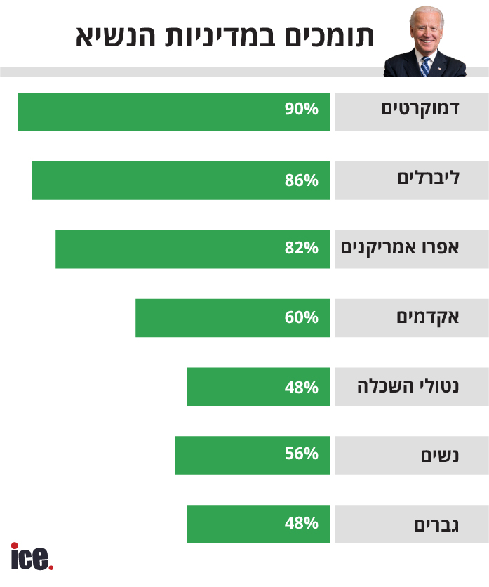 את עיקר התמיכה בו מקבל הנשיא ביידן כצפוי מהמצביעים הדמוקרטים. 90% מהדמוקרטים הביעו תמיכה במדיניות נשיא ארה"ב במאה הימים הראשונים, הליברלים לא מאוד רחוקים מהם עם 86%, בקרב האוכלוסיה האפרו-אמריקנית 82% תמכו.