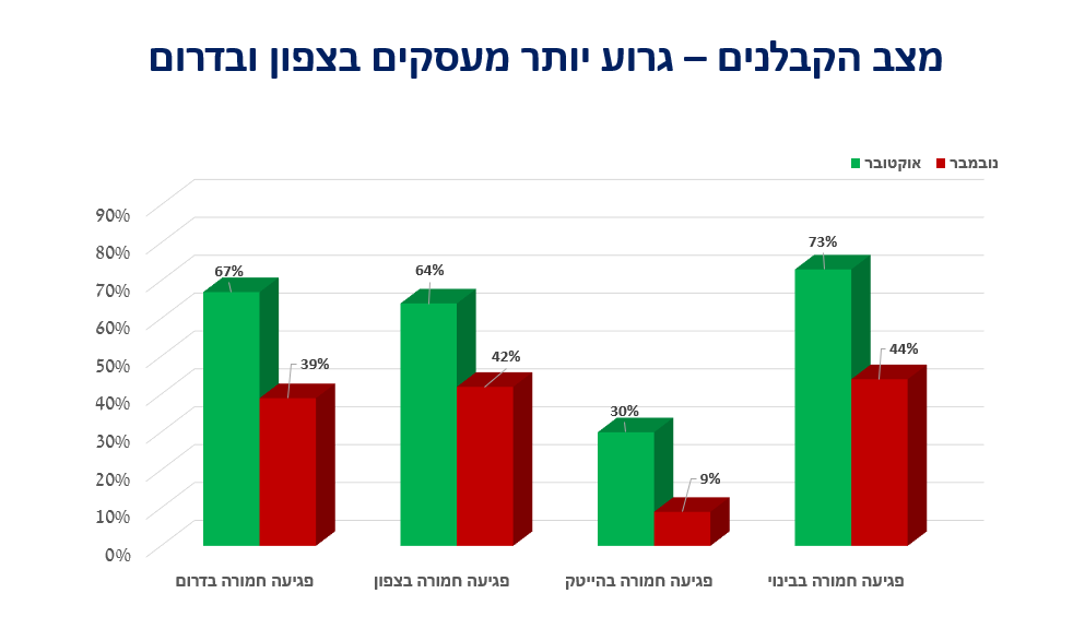 בינתיים, העובדות בשטח מדברות: בעוד שההייטק הישראלי מתאושש במהירות מהמשבר הנוכחי – רק 9% מהחברות שהשתתפו בסקר למ"ס, צפו פגיעה חמורה בהכנסות לחודש נובמבר – מנוע חשוב אחר, הבנייה, נותר הרחק מאחור. שם, כמעט מחצית מהקבלנים דיווחו על נזק כבד בנובמבר – אפילו יותר מאשר עסקים בקו העימות הצפוני והדרומי. אם מביאים בחשבון את רמות המינוף הגבוהות בנדל"ן, ואת החשיפה הספציפית של הבנקים להלוואות שנטל המגזר, מבינים שללא טיפול נכון הבעיה המקומית עוד עלולה להתפתח לסיכון היציבות הכלכלית כולה.
