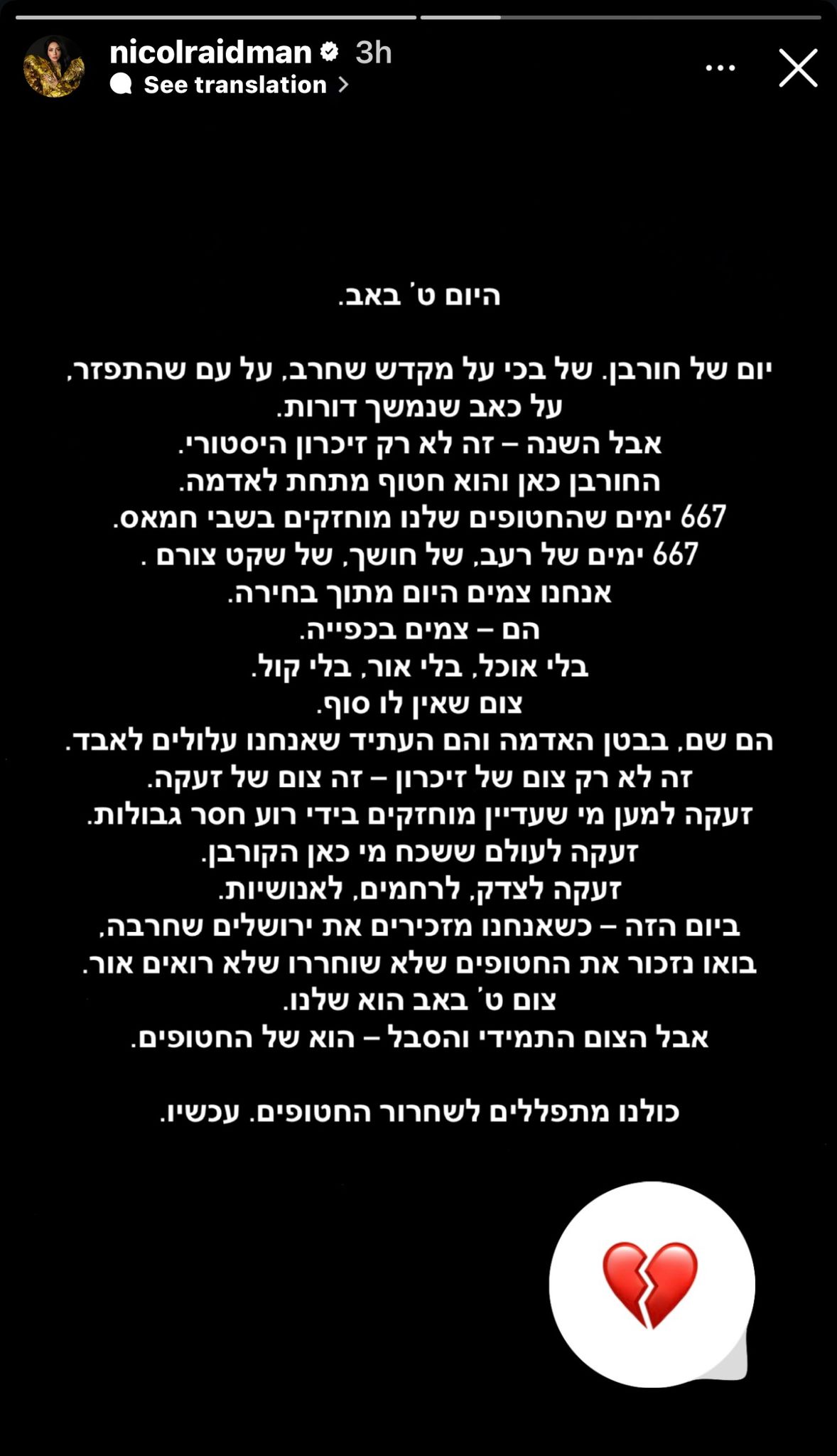 הדוגמנית ואשת העסקים ניקול ראידמן משתפת בכאב את תחושותיה בצל צום תשעה באב שחל היום והמצב של עם ישראל ביחס למשמעות הצום, כך שיתפה הבוקר (ראשון) בסטורי בעמוד האינסטגרם שלה: "היום ט’ באב. יום של חורבן. של בכי על מקדש שחרב, על עם שהתפזר, על כאב שנמשך דורות. אבל השנה, זה לא רק זיכרון היסטורי. החורבן כאן והוא חטוף מתחת לאדמה. 667 ימים שהחטופים שלנו מוחזקים בשבי חמאס. 667 ימים של רעב, של חושך, של שקט צורם".