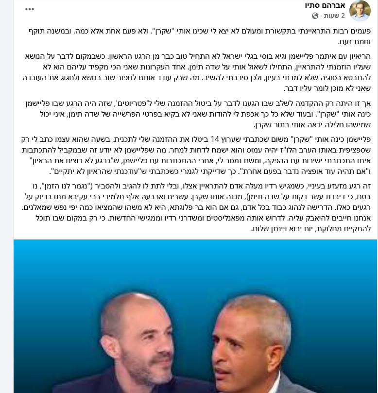 ברקע הדברים, סאגת ביטול הריאיון בפטריוטים, לאחר הזמנתו של איתמר פליישמן שיבוא להתארח שם.
