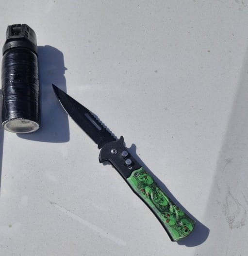 תמונת הסכין וגז הפלפל שנתפסו. קרדיט צילום: דוברות המשטרה