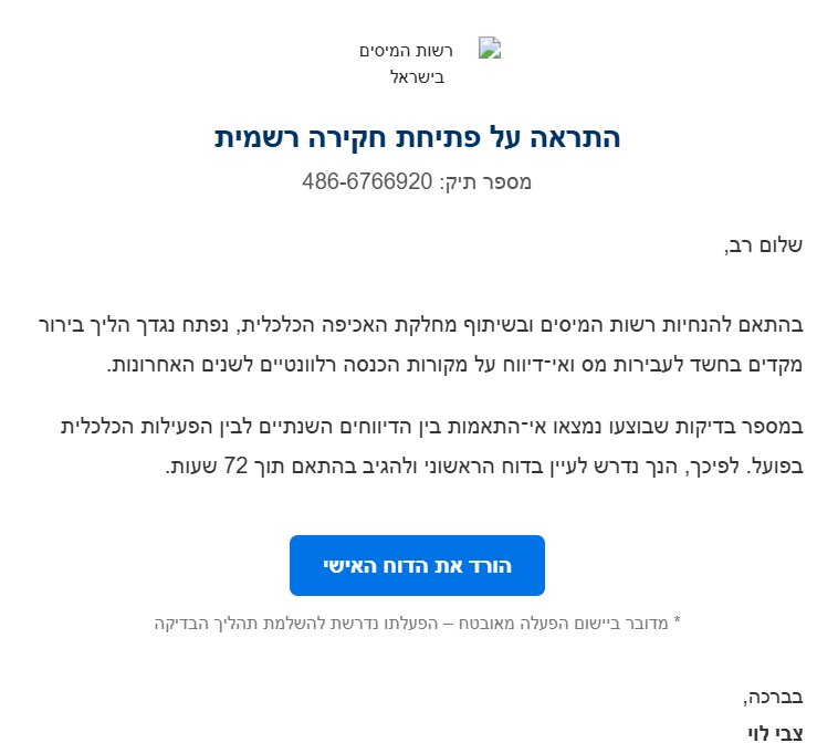 בהודעה שנכתבה במייל שהגיע הוסבר: ''התראה על פתיחת חקירה רשמית מספר תיק: 486-6766920. שלום רב, בהתאם להנחיות רשות המיסים ובשיתוף מחלקת האכיפה הכלכלית, נפתח נגדך הליך בירור מקדים בחשד לעבירות מס ואי־דיווח על מקורות הכנסה רלוונטיים לשנים האחרונות''.