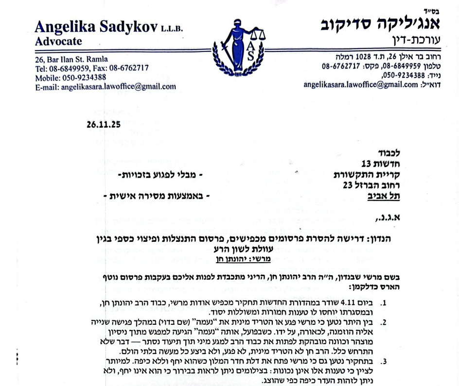 שלושה שבועות לאחר שידור התחקיר של אריאלה שטרנבך בחדשות 13, העוסק ברב יהונתן חן מאלעד, הפרשה הולכת ומחריפה ומקבלת כעת גם ממד משפטי. לצד ניסיונות שקטים שנעשו מול הנהלת הערוץ להסרת התחקיר, נמסר לחדשות 13 מכתב התראה חריף הדורש הסרת הפרסום, התנצלות רשמית ופיצוי כספי ניכר.
