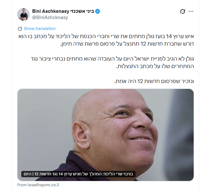 בינתיים, הכתב הפוליטי של ישראל היום, ביני אשכנזי, פרסם אתמול כי "איש ערוץ 14 בועז גולן מחתים את שרי וחברי הכנסת של הליכוד על מכתב בו הוא דורש שחברת חדשות 12 תתנצל על פרסום פרשת שדה תימן. גולן לא הגיב לפניית ישראל היום על העובדה שהוא מחתים נבחרי ציבור נגד המתחרים שלו על מכתב התנצלות. ונזכיר שפרסום חדשות 12 היה אמת".