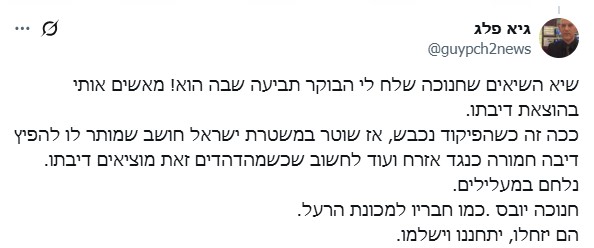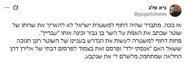 היום (שלישי) פלג כתב בחשבון ה-X שלו את ההתפתחויות האחרונות בנושא. "מתברר שהיה דחוף למשטרת ישראל לא להאריך את שרותו של שוטר שכתב את האמת על השר בן גביר וכינה אותו 'עבריין'. פחות דחוף למשטרה לעשות את הנדרש בעניינו של השוטר רונן חנוכה ששאל האם 'אנסתי ילד' ופרסם זאת בצמוד לפרסום דבתי של אלירן דהן החלאה שמתחמק מלשלם לי את שנקבע", כתב.