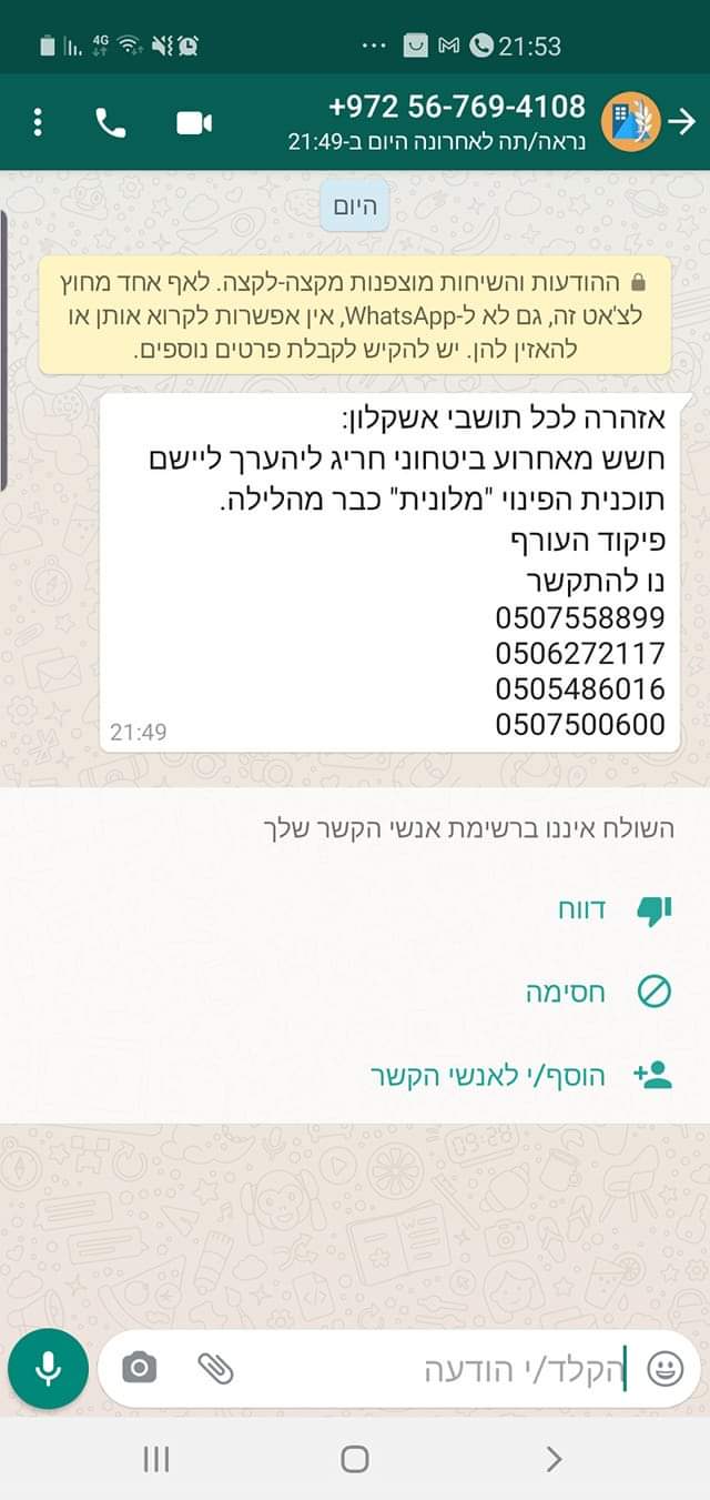 במהלך שעות הלילה הופץ ברשתות החברתיות ובפלטפורמות מסרונים שונות מידע כוזב לגבי חשש מאירוע ביטחוני באשקלון וכן לגבי אזהרה בנתיבות. הוגשה תלונה במשטרת ישראל כנגד מפיץ ההודעה שכונה: "מתחזה נבזי"