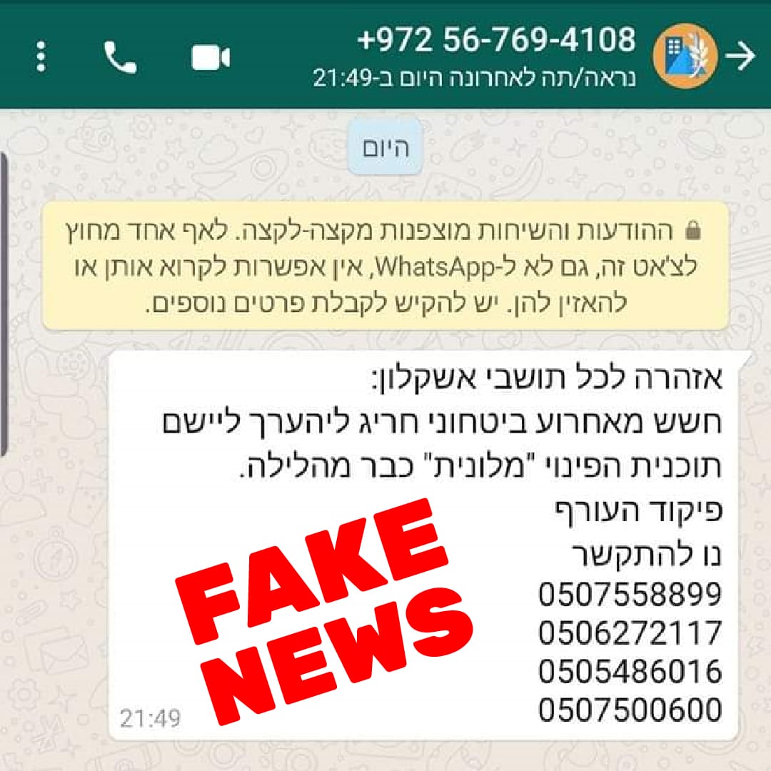 מי הוא אותו אדם חסר אחריות שמפיץ מידע לא מבוסס שגורם לבהלה גדולה כל כך לתושבי הדרום בימים מתוחים אלו כשעריהם מופצצות בטילים מעזה? בקבוצות הוואטסאפ של העיתונאים הזהירו מפני הודעות שקריות שמופצות בכל הפלטפורמות שלא הגיעו מטעם פיקוד העורף ואין להן כל ביסוס.