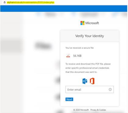 נמען אשר קיבל את המייל והקליק על הקישורים, מגיע לעמוד אשר נראה כעמוד כניסה למיקרוסופט 365, ושם הוא מתבקש להזין את פרטי המייל שלו על מנת לקבל גישה לקובץ ששלחו לו.