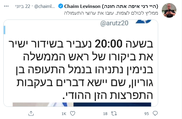 ערוץ 20 הגיש היום (חמישי) כתב תביעה נגד העיתונאי חיים לוינסון לאחר שלוינסון העלה בציוץ לדף הטוויטר שלו צילום מסך מזוייף של ציוץ של ערוץ 20 לאחר הקמת הממשלה ולעג לו בכך שהערוץ מביע תמיכה בראש הממשלה לשעבר בנימין נתניהו.