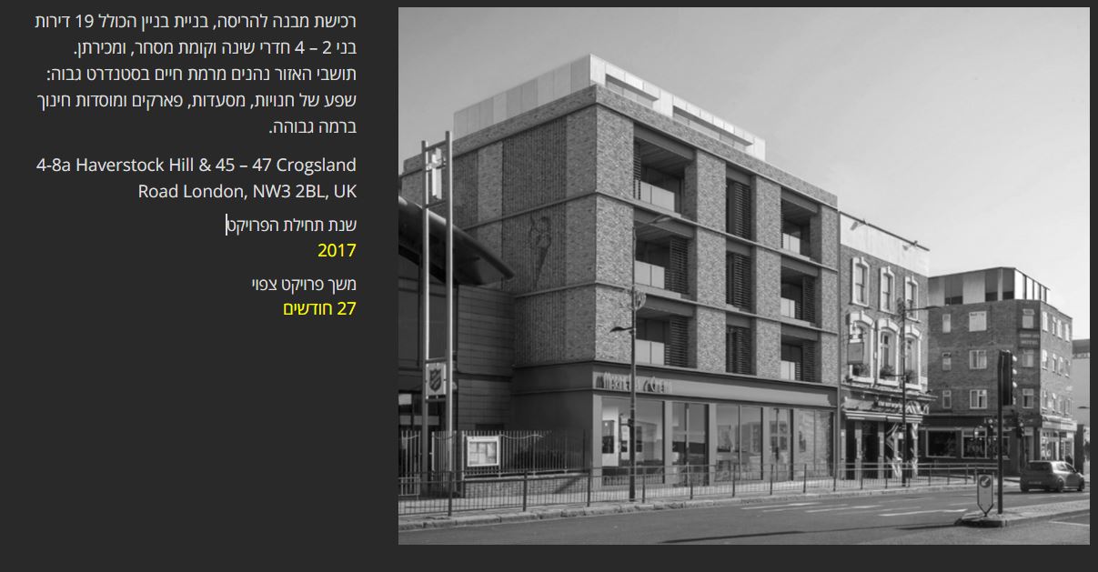 צילום מסך מתוך אתר "הגשמה" ובו תקציר פרויקט להשקעה בלונדון